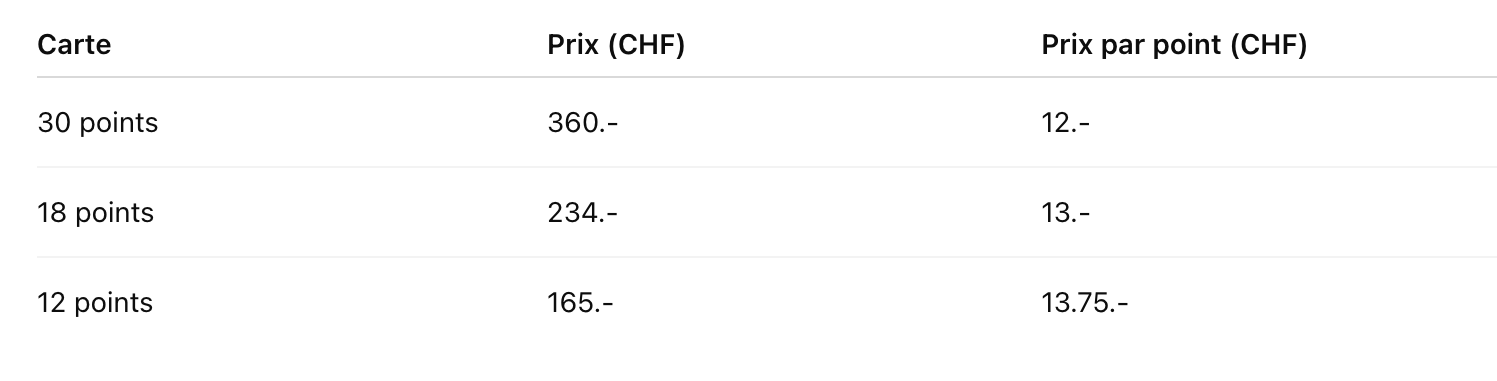 - Cartes à points (idéal pour plus de liberté et d’économies) : 3 points, détaillée ci-dessous